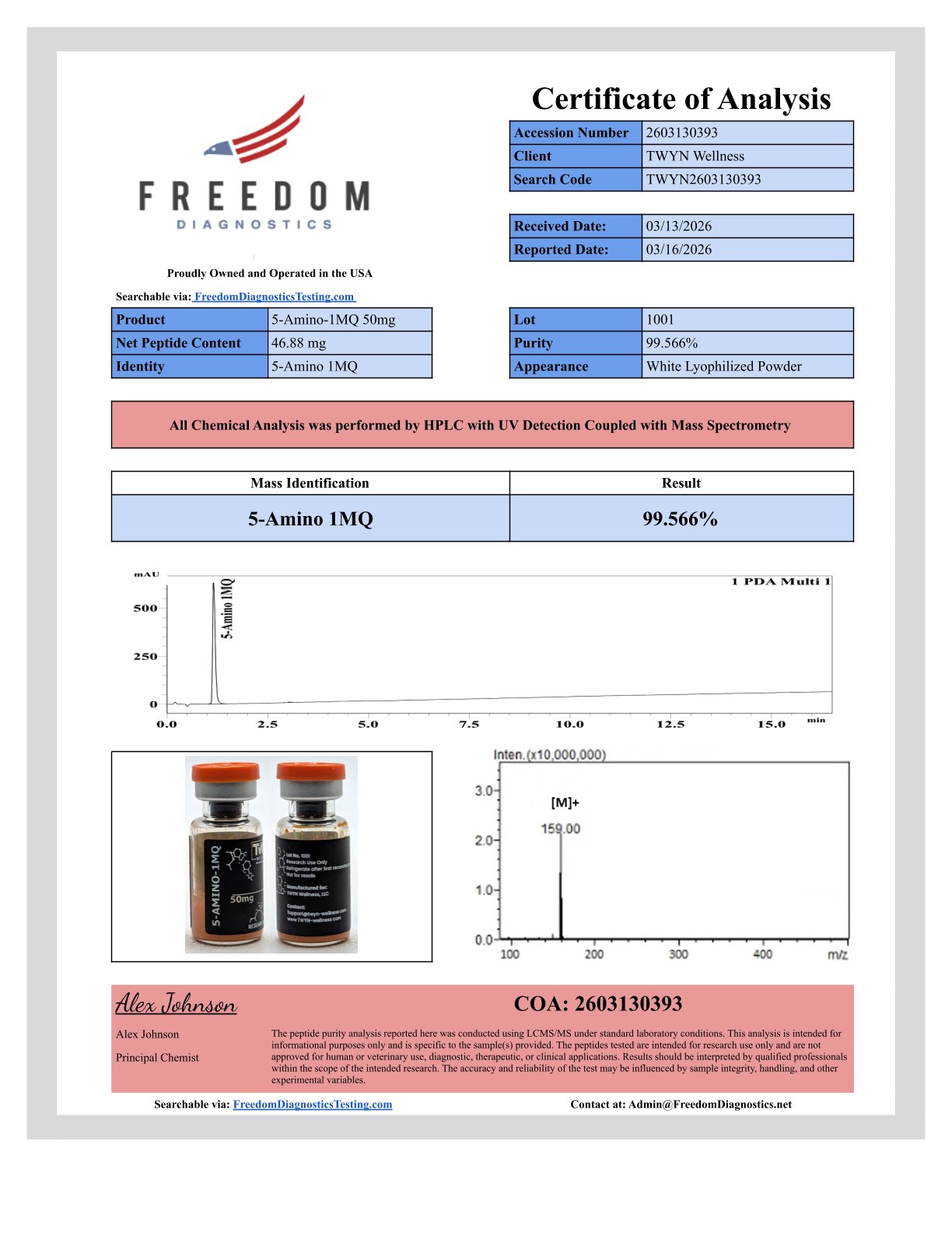 5-amino-1MQ is a small-molecule quinolinium analog studied in laboratory settings as an inhibitor of the enzyme nicotinamide N-methyltransferase (NNMT). 5-Amino-1MQ research focuses on how modulation of NNMT influences nicotinamide metabolism and NAD⁺-related cellular pathways. NNMT is expressed in multiple tissues and is frequently examined in adipose, liver, and skeletal muscle models because these systems provide measurable metabolic and transcriptional readouts under controlled conditions.