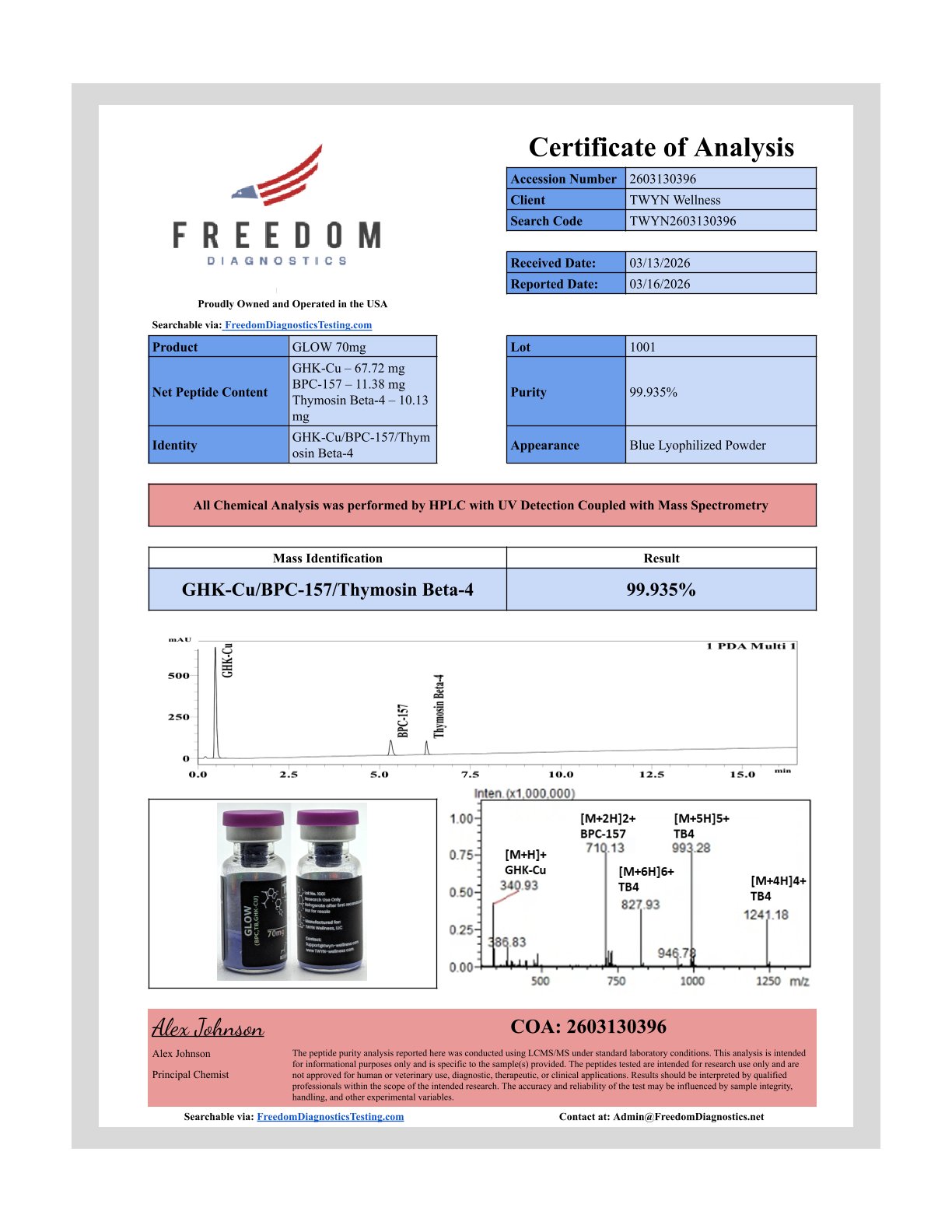 The Glow Blend combines three research peptides, BPC-157, TB-500, and GHK-Cu, formulated for studies on cellular repair, angiogenesis, and extracellular matrix regulation. BPC-157 is a 15 amino acid gastric peptide fragment that modulates nitric oxide and growth factor pathways. TB-500, a segment of Thymosin Beta-4, influences actin polymerization and tissue remodeling. GHK-Cu is a copper(II)-complexed tripeptide that regulates metalloprotein activity and redox signaling. Together, these peptides are used in research examining molecular regeneration, cytoprotection, and peptide–metal interaction mechanisms.