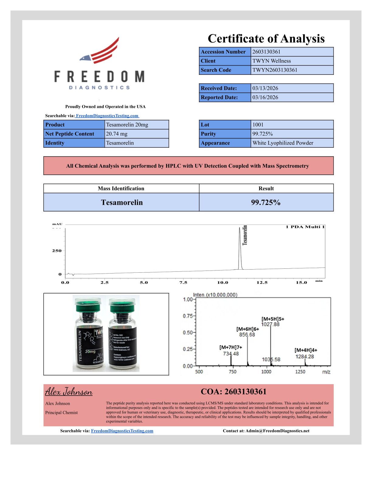 Tesamorelin is a stabilized synthetic peptide analog of growth hormone-releasing hormone (GHRH 1–44) containing a trans-3-hexenoic acid modification at position 2. It binds GHRH receptors to enhance GH synthesis and secretion in experimental settings. Tesamorelin is used in endocrine and metabolic research to examine peptide stability, receptor binding kinetics, and somatotropic axis modulation.